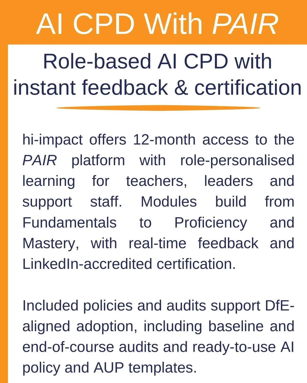 AI-CPD is designed to give the school or trust a clear structure for building staff confidence and consistency, with evidence of progress over time. It combines guided learning, practical activities and simple tools that help leaders set direction and support staff to apply AI safely in day-to-day work.