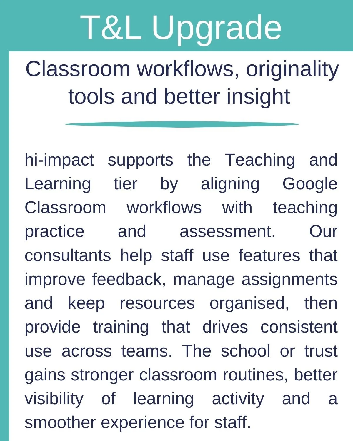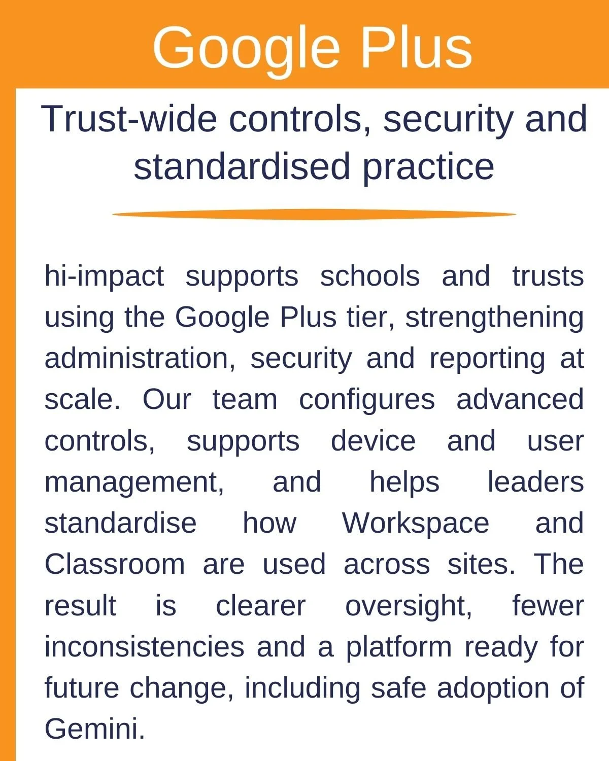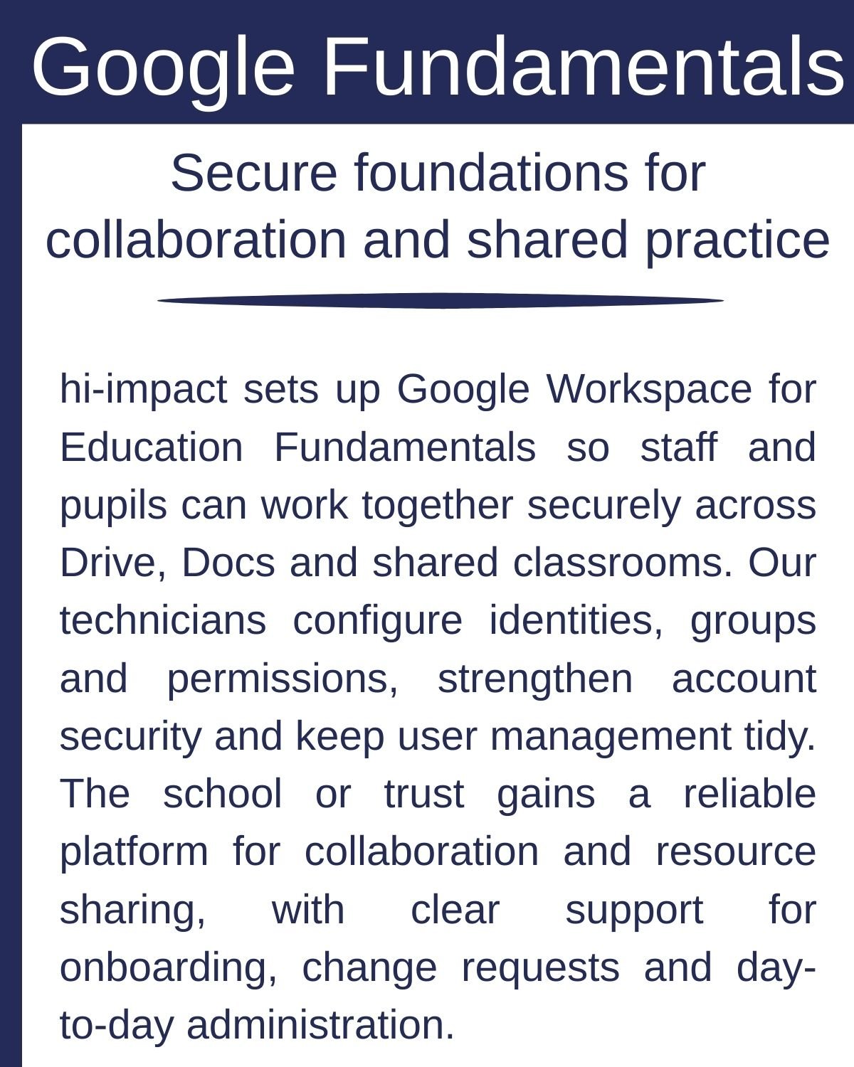 hi-impact supports setup, cloud migration, day-to-day administration and training, helping staff use Workspace confidently while keeping security, safeguarding and safe AI integration at the centre.